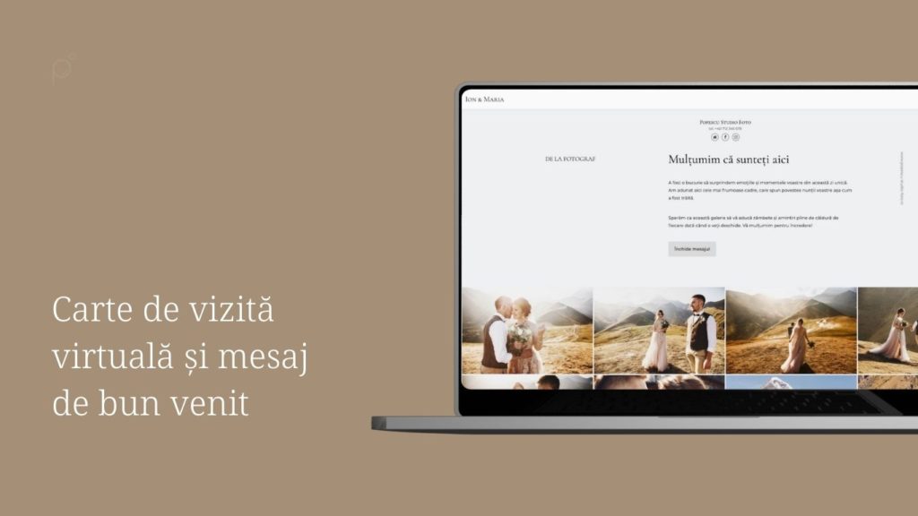 Exemplu în Photonesto: Fotograful poate crea o carte de vizită virtuală și poate adăuga un mesaj de întâmpinare.